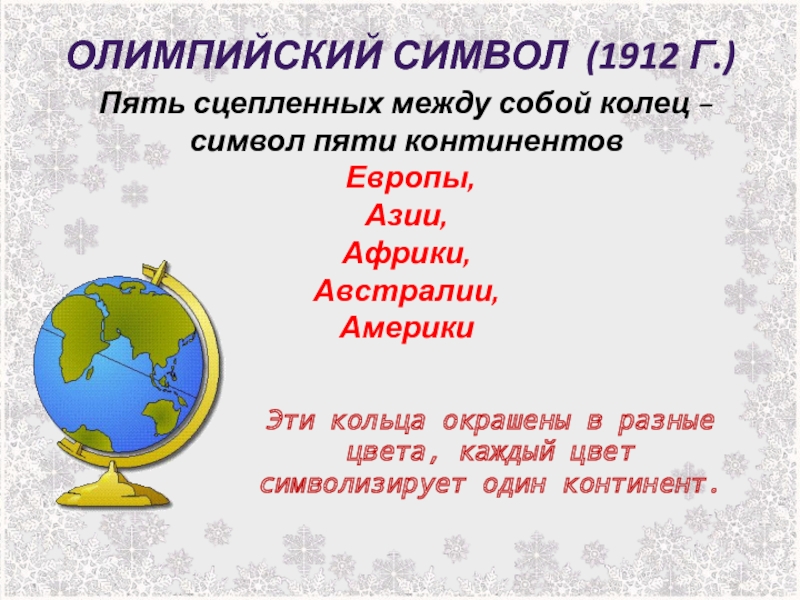 Эти кольца окрашены в разные цвета, каждый цвет символизирует один континент.