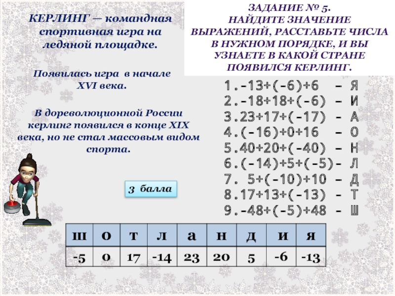 НАЙДИТЕ ЗНАЧЕНИЕ ВЫРАЖЕНИЙ, РАССТАВЬТЕ ЧИСЛА В НУЖНОМ ПОРЯДКЕ, И ВЫ УЗНАЕТЕ В КАКОЙ СТРАНЕ ПОЯВИЛСЯ КЕРЛИНГ.