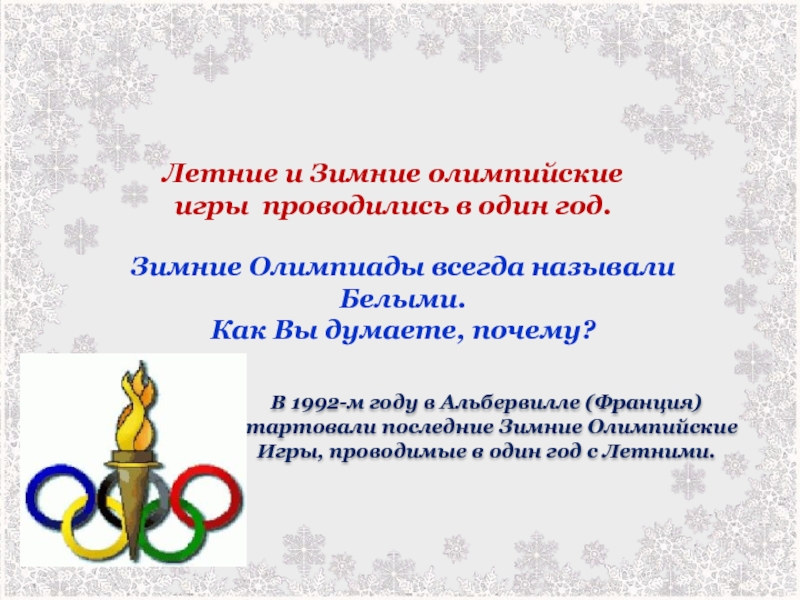 В 1992-м году в Альбервилле (Франция) стартовали последние Зимние Олимпийские Игры, проводимые в один год с Летними.