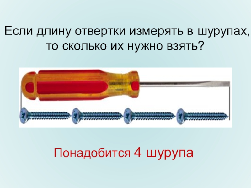 Слайд 39Если длину отвертки измерять в шурупах, то сколько их нужно взять?
