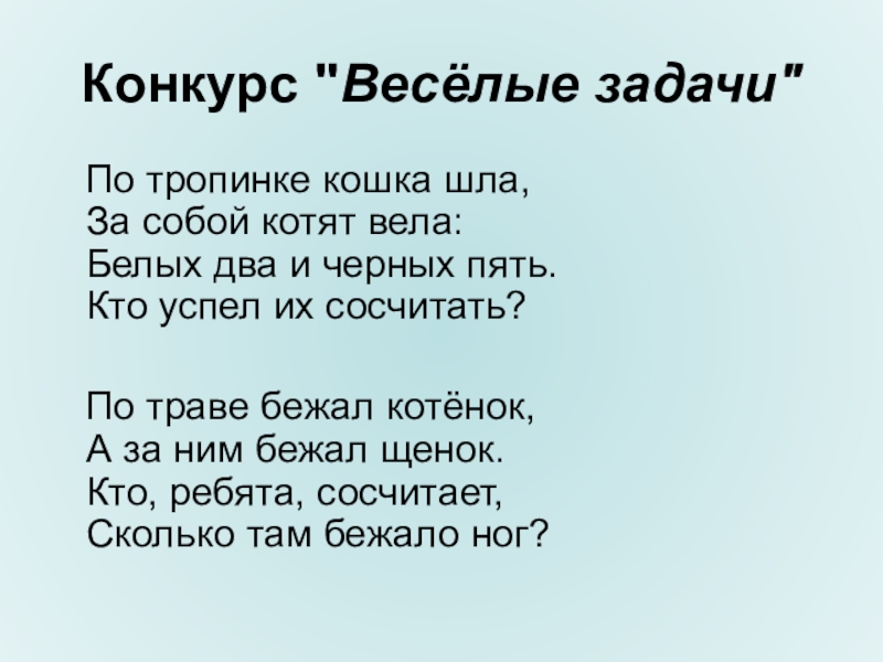 По траве бежал котёнок, А за ним бежал щенок. Кто, ребята, сосчитает, Сколько там бежало ног?