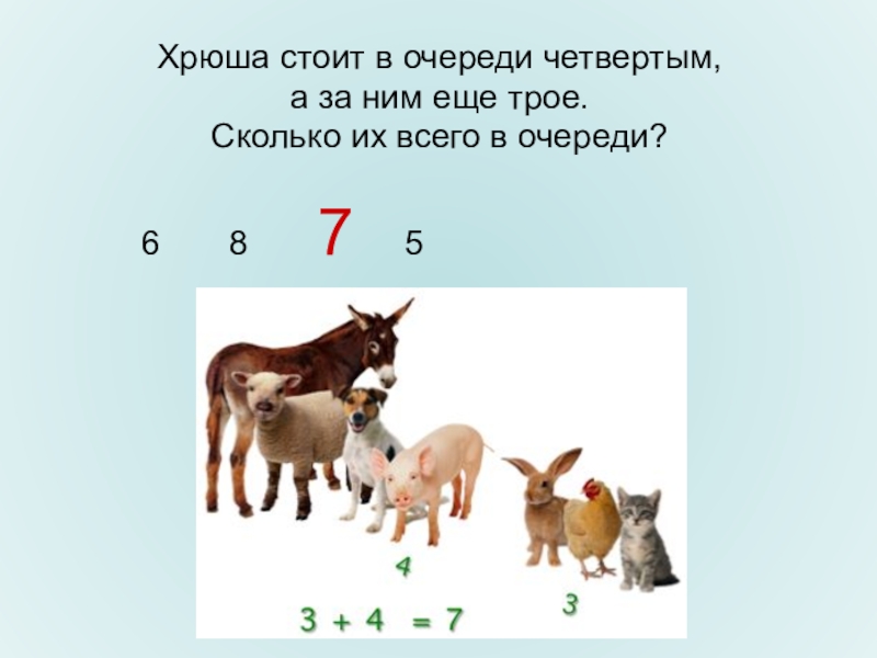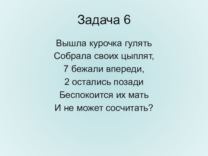 Задача 6Вышла курочка гулятьСобрала своих цыплят,7 бежали впереди,2 остались позадиБеспокоится их матьИ не может сосчитать?