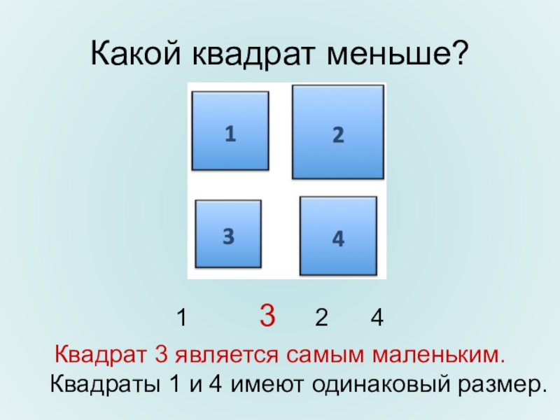 Какой квадрат меньше? 1			3		2		4Квадрат 3 является самым маленьким.  Квадраты 1 и 4 имеют одинаковый размер.
