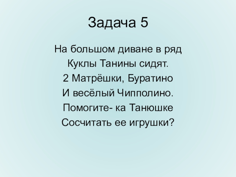 Задача 5На большом диване в рядКуклы Танины сидят.2 Матрёшки, БуратиноИ весёлый Чипполино.Помогите- ка ТанюшкеСосчитать ее игрушки?