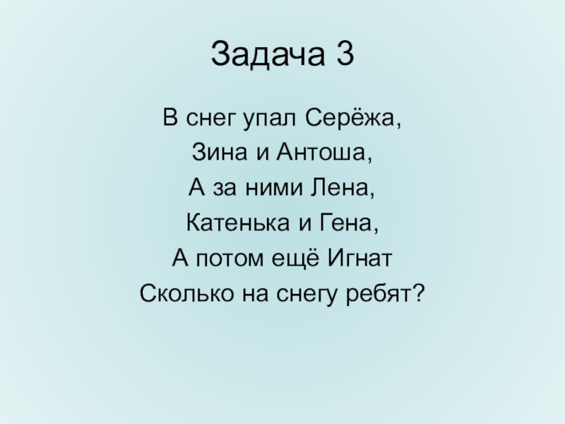 Задача 3В снег упал Серёжа,Зина и Антоша,А за ними Лена,Катенька и Гена,А потом ещё ИгнатСколько на снегу