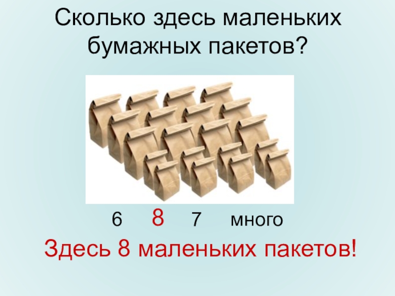 Слайд 33Сколько здесь маленьких бумажных пакетов? 6 8 7 много Здесь 8 маленьких пакетов!