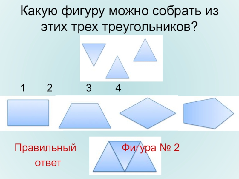 Какую фигуру можно собрать из этих трех треугольников? 	 1		  2			3		 4	Правильный 				Фигура № 2