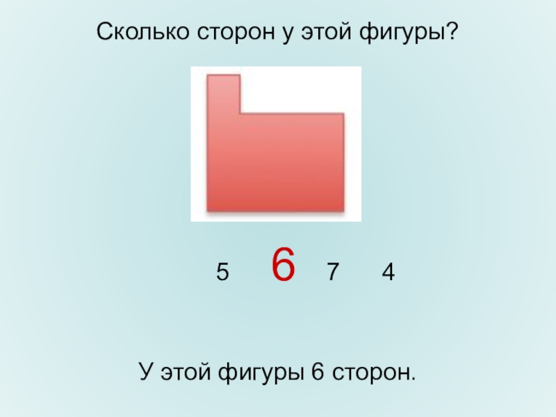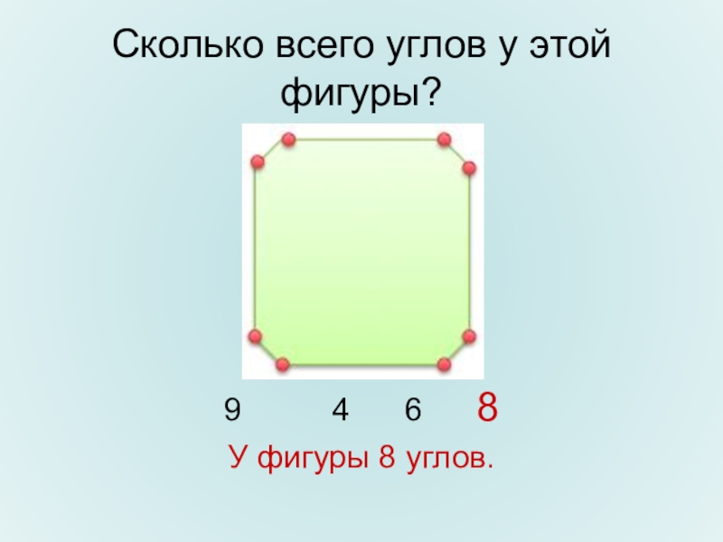 Сколько всего углов у этой фигуры? 9			4		6		8У фигуры 8 углов.