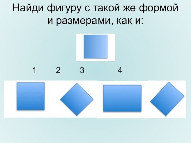 Найди фигуру с такой же формой и размерами, как и: 	  1		 2		  3