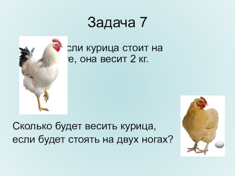 Задача 7				Если курица стоит на 				одной ноге, она весит 2 кг.Сколько будет весить курица, если будет стоять