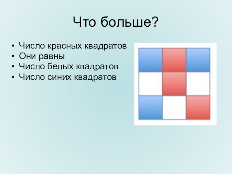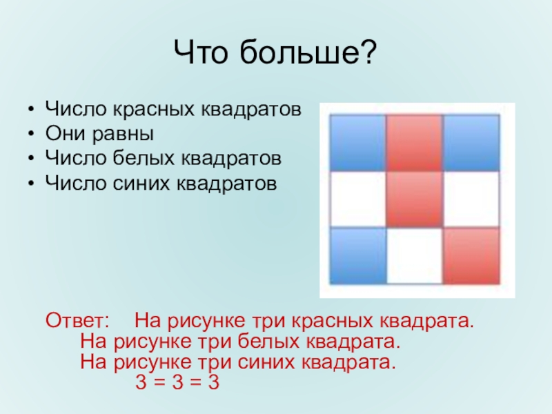 Что больше? Число красных квадратов Они равныЧисло белых квадратов Число синих квадратов