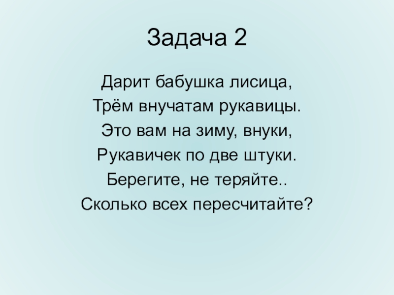 Задача 2Дарит бабушка лисица,Трём внучатам рукавицы.Это вам на зиму, внуки,Рукавичек по две штуки.Берегите, не теряйте..Сколько всех пересчитайте?