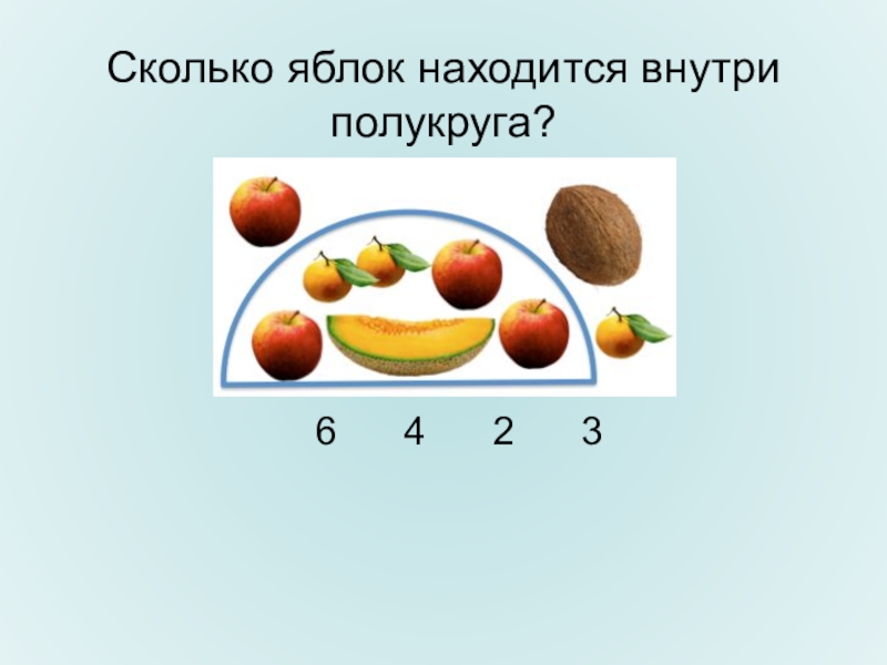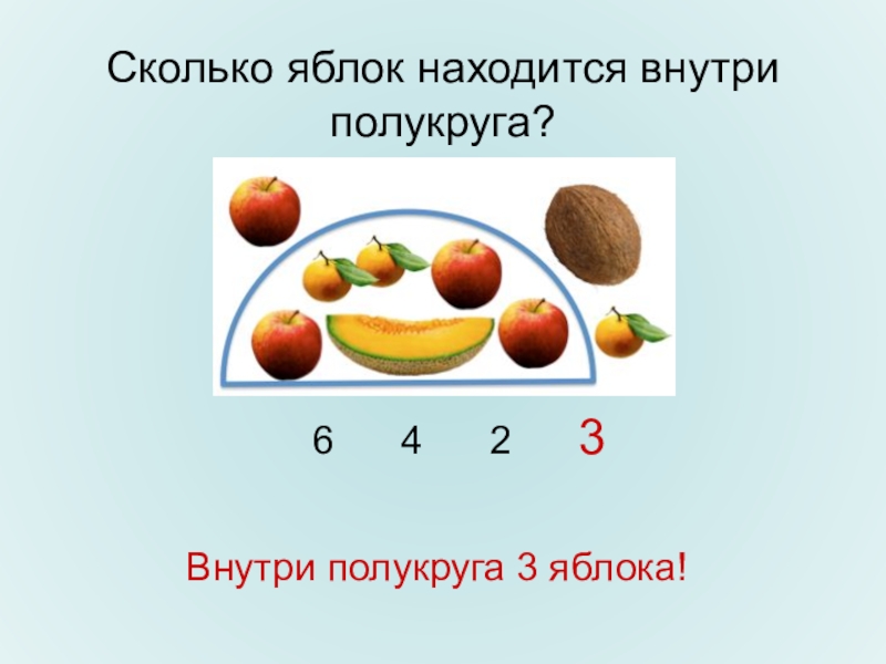 Сколько яблок находится внутри полукруга?  	6		4		2		3Внутри полукруга 3 яблока!