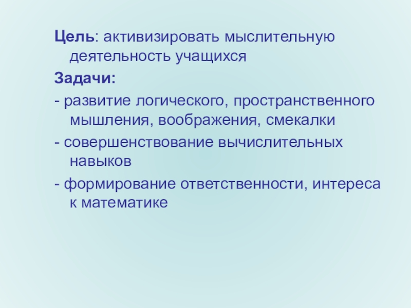 Цель: активизировать мыслительную деятельность учащихсяЗадачи: - развитие логического, пространственного мышления, воображения, смекалки- совершенствование вычислительных навыков- формирование ответственности, интереса к математике