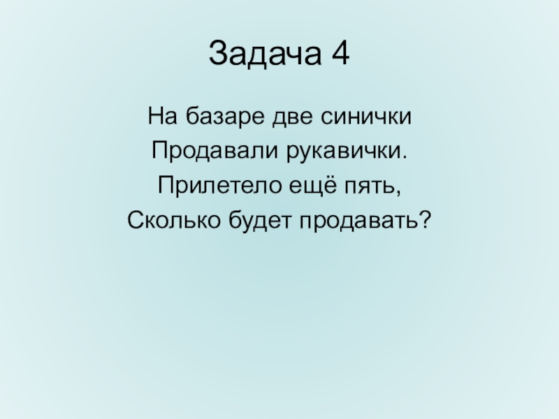 Задача 4На базаре две синичкиПродавали рукавички.Прилетело ещё пять, Сколько будет продавать?