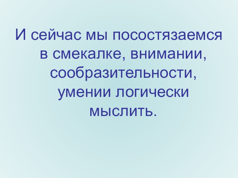 Слайд 6И сейчас мы посостязаемся в смекалке, внимании, сообразительности, умении логически мыслить.