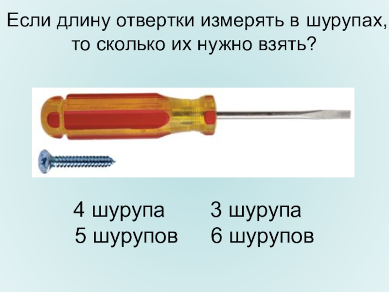 Слайд 38Если длину отвертки измерять в шурупах, то сколько их нужно взять?