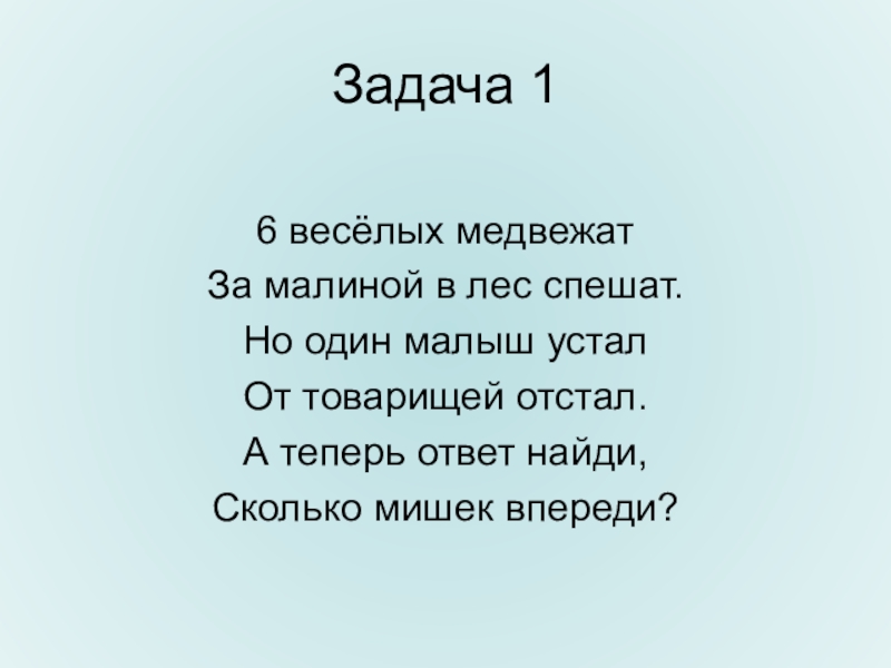 Задача 16 весёлых медвежатЗа малиной в лес спешат.Но один малыш усталОт товарищей отстал.А теперь ответ найди,Сколько мишек