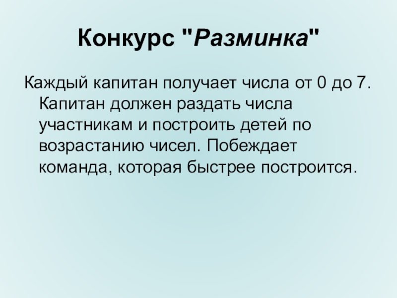 должен раздать числа участникам и построить детей по возрастанию чисел. Побеждает команда, которая быстрее построится.