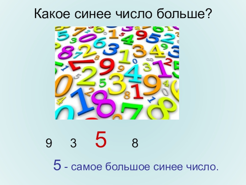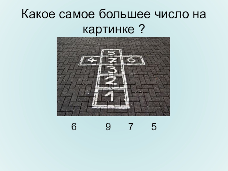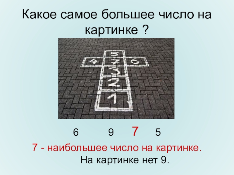 Какое самое большее число на картинке ? 6			9		7		57 - наибольшее число на картинке.  На картинке нет
