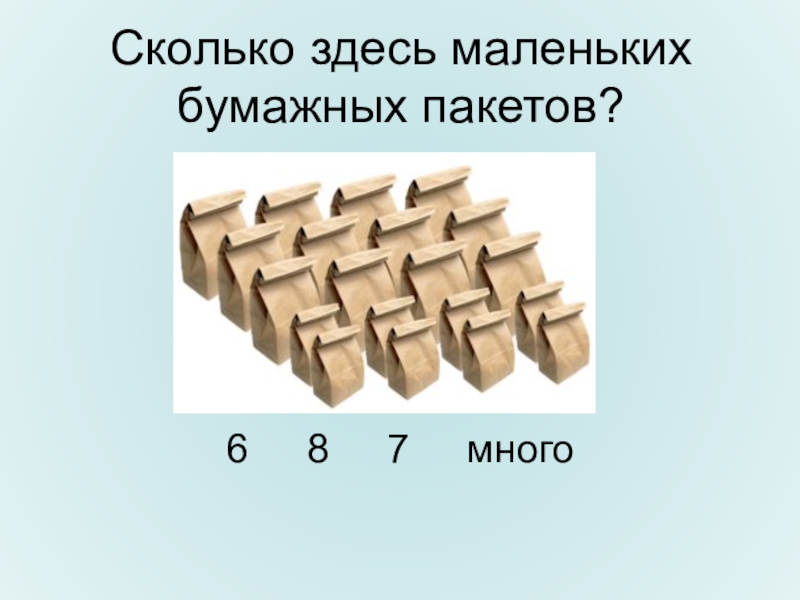 Слайд 32Сколько здесь маленьких бумажных пакетов? 6 8 7 много