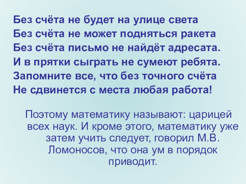 Без счёта не будет на улице светаБез счёта не может подняться ракетаБез счёта письмо не найдёт адресата.И