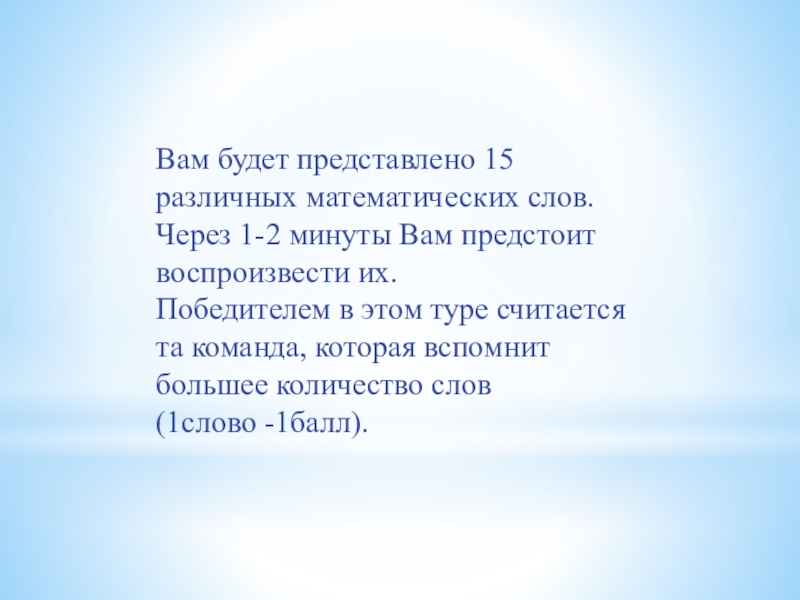 Слайд 5Вам будет представлено 15 различных математических слов. Через 1-2 минуты Вам