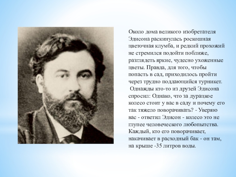 Однажды кто-то из друзей Эдисона спросил: Однако, что за дурацкое колесо стоит у вас в саду и почему его так тяжело поворачивать? - Уверяю вас - ответил Эдисон - колесо это не глупее человеческого любопытства. Каждый, кто его поворачивает, накачивает в расходный бак - он там, на крыше -35 литров воды.