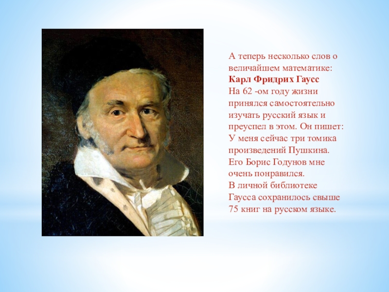 Слайд 7А теперь несколько слов о величайшем математике: Карл Фридрих Гаусс