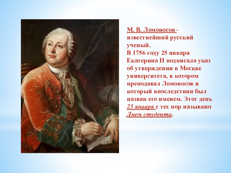 Екатерина II подписала указ об утверждении в Москве университета, в котором преподавал Ломоносов и который впоследствии был назван его именем. Этот день 25 января с тех пор называют Днем студента.