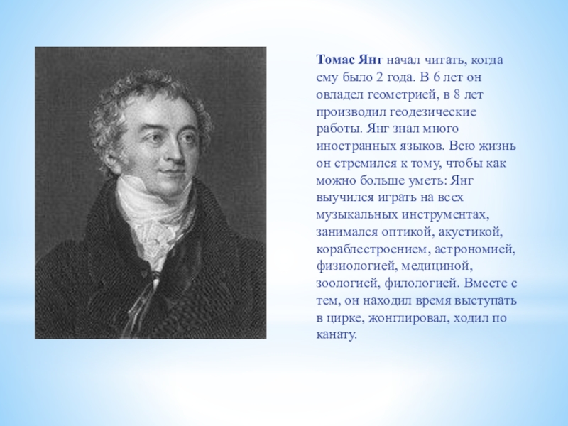 Слайд 17Томас Янг начал читать, когда ему было 2 года. В 6