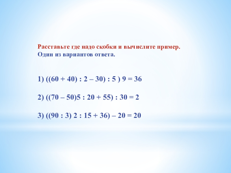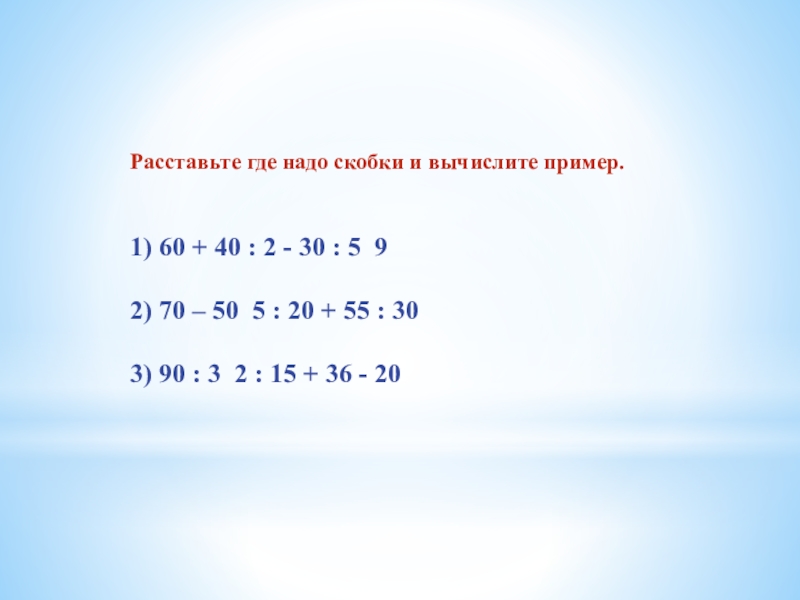 Слайд 9Расставьте где надо скобки и вычислите пример.