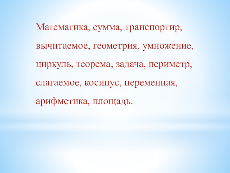 Слайд 6Математика, сумма, транспортир, вычитаемое, геометрия, умножение, циркуль, теорема, задача, периметр, слагаемое,