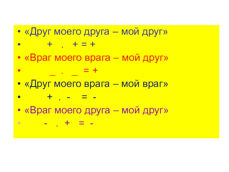 «Друг моего друга – мой друг» + . + = +«Враг моего врага – мой друг» _ . _ = +«Друг моего врага – мой враг»