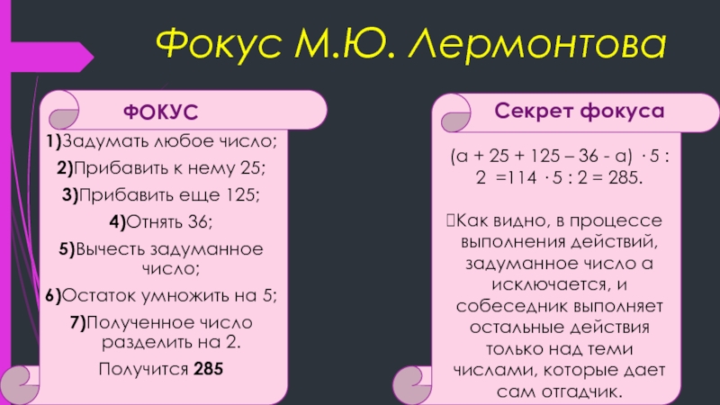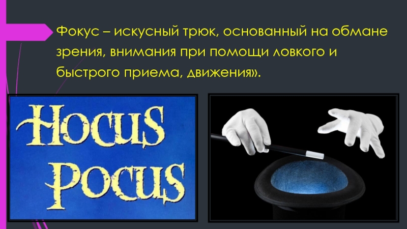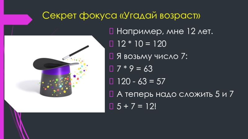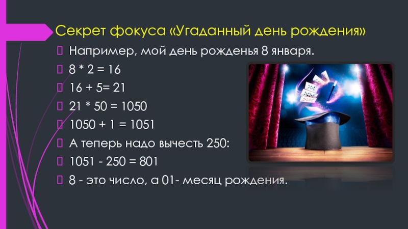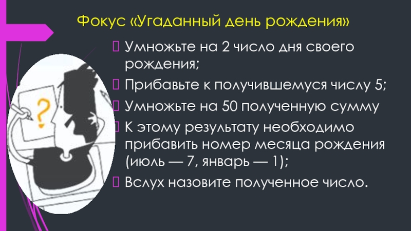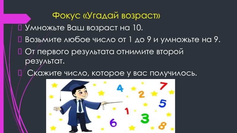 Математические фокусы - фокусы, основанные на использовании математических закономерностей, арифметических и алгебраических действиях.