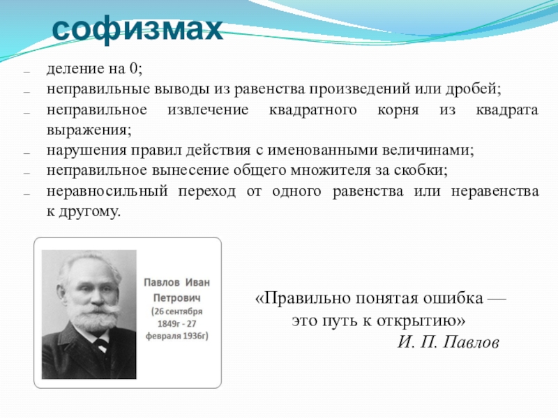неправильные выводы из равенства произведений или дробей;