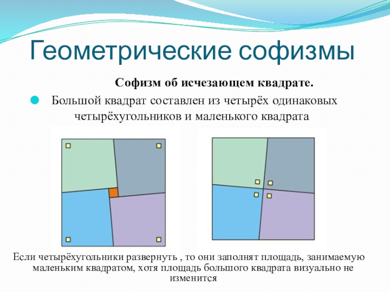 Если четырёхугольники развернуть , то они заполнят площадь, занимаемую маленьким квадратом, хотя площадь большого квадрата визуально не изменится