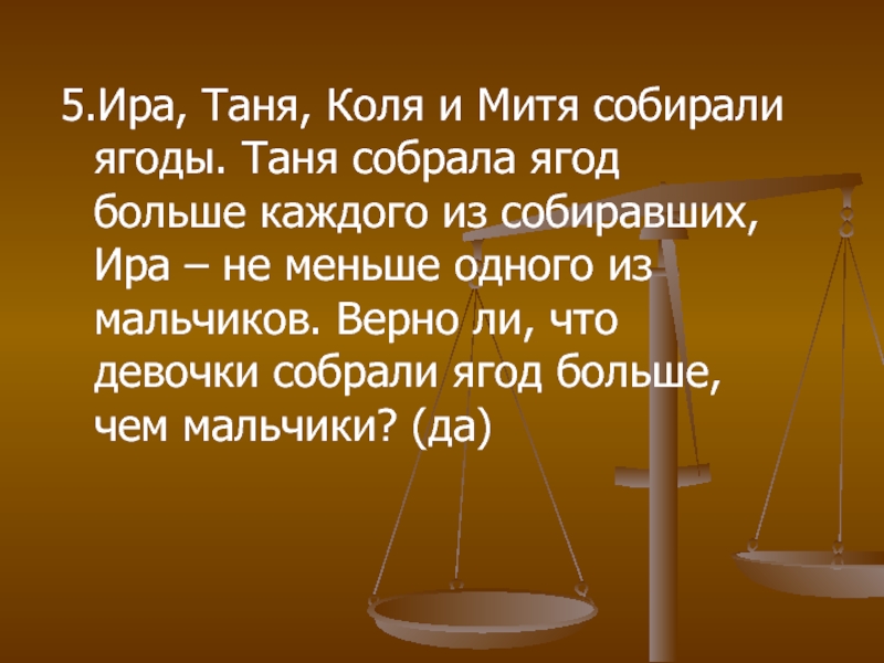 Слайд 225.Ира, Таня, Коля и Митя собирали ягоды. Таня собрала ягод больше