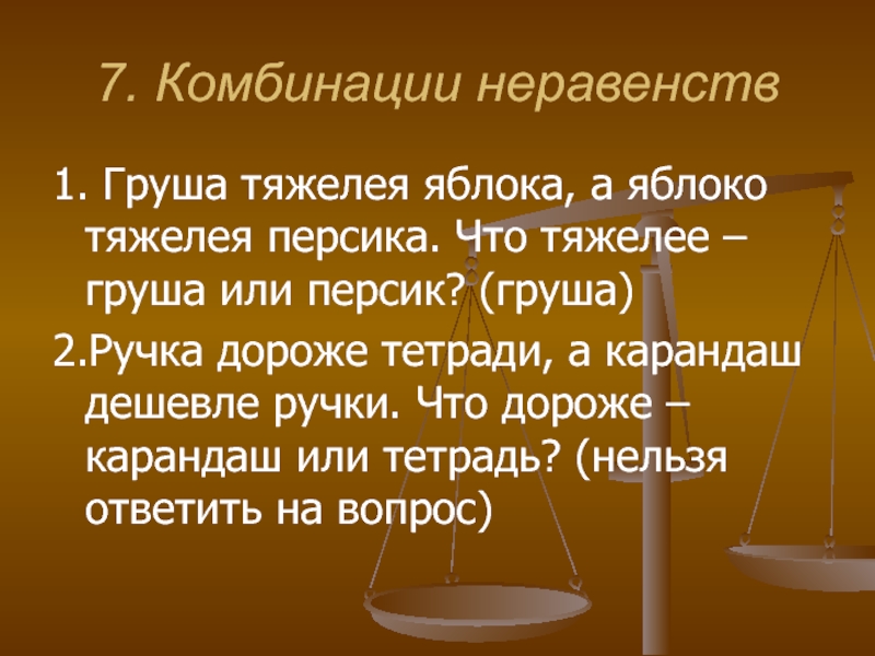 1. Груша тяжелея яблока, а яблоко тяжелея персика. Что