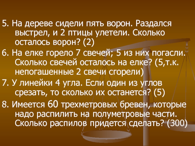 6. На елке горело 7 свечей; 5 из них погасли. Сколько свечей осталось на елке? (5,т.к. непогашенные 2 свечи сгорели)