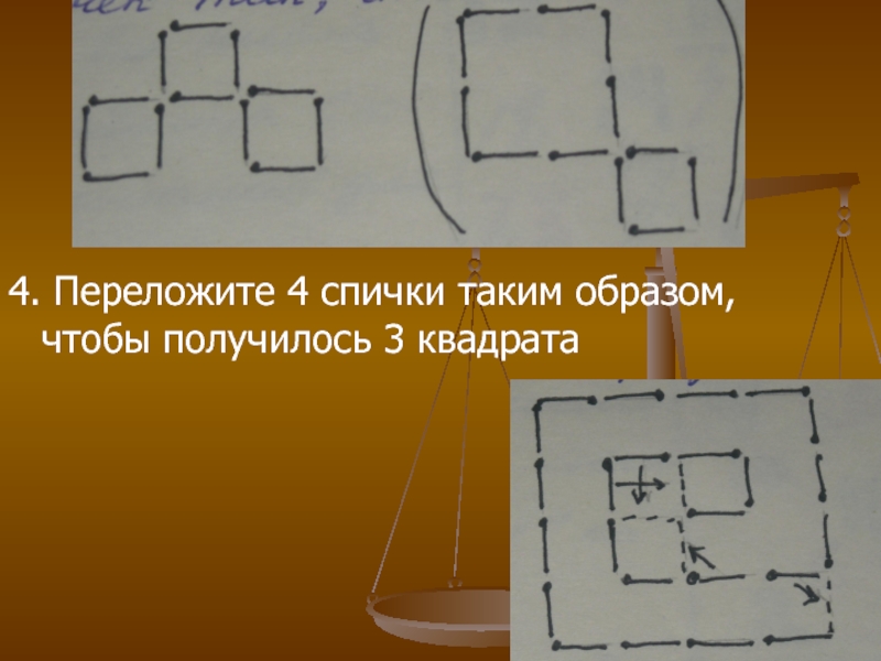 4. Переложите 4 спички таким образом, чтобы получилось 3 квадрата