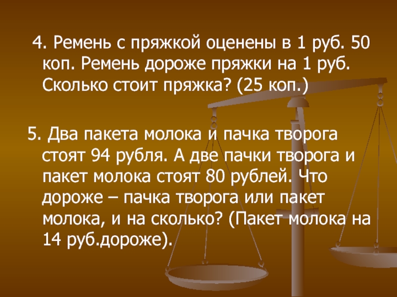 5. Два пакета молока и пачка творога стоят 94 рубля. А две пачки творога и пакет молока стоят 80 рублей. Что дороже – пачка творога или пакет молока, и на сколько? (Пакет молока на 14 руб.дороже).