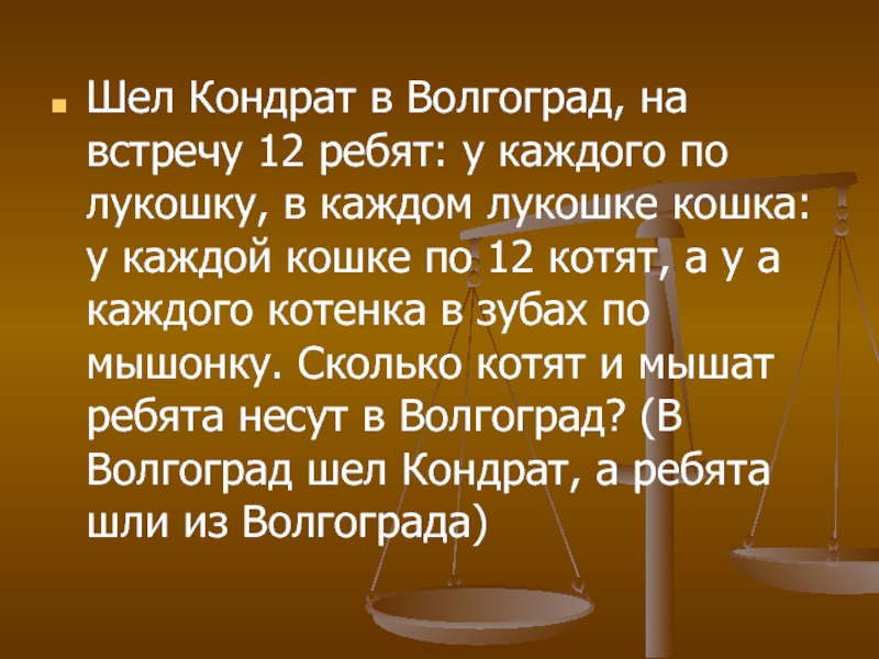 лукошку, в каждом лукошке кошка: у каждой кошке по 12 котят, а у а каждого котенка в зубах по мышонку. Сколько котят и мышат ребята несут в Волгоград? (В Волгоград шел Кондрат, а ребята шли из Волгограда)