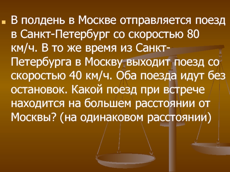 км/ч. В то же время из Санкт-Петербурга в Москву выходит поезд со скоростью 40 км/ч. Оба поезда идут без остановок. Какой поезд при встрече находится на большем расстоянии от Москвы? (на одинаковом расстоянии)