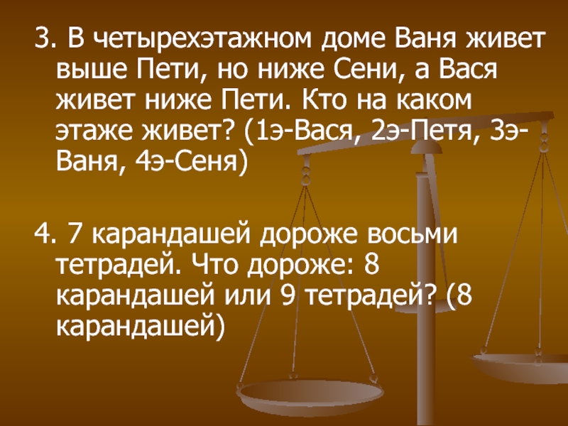Слайд 213. В четырехэтажном доме Ваня живет выше Пети, но ниже Сени,