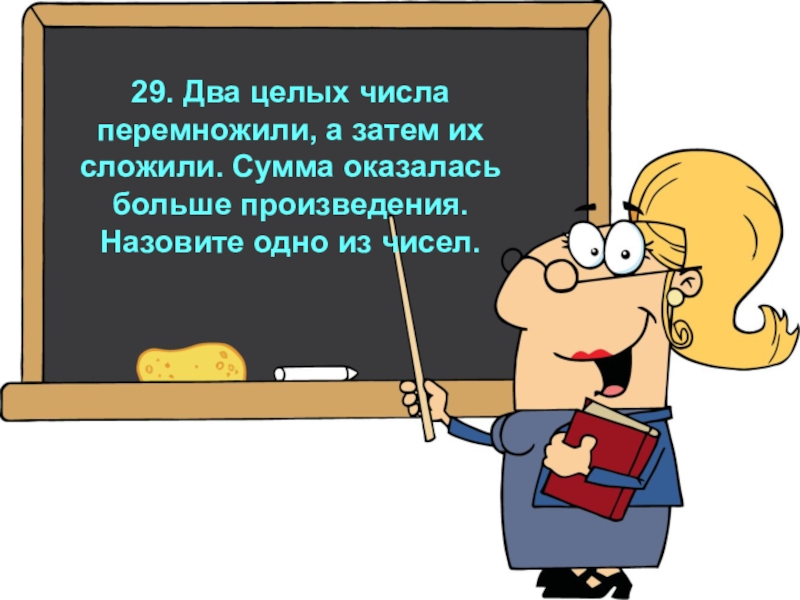 29. Два целых числа перемножили, а затем их сложили. Сумма оказалась больше произведения. Назовите одно из чисел.