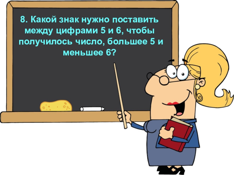 8. Какой знак нужно поставить между цифрами 5 и 6, чтобы получилось число, большее 5 и меньшее