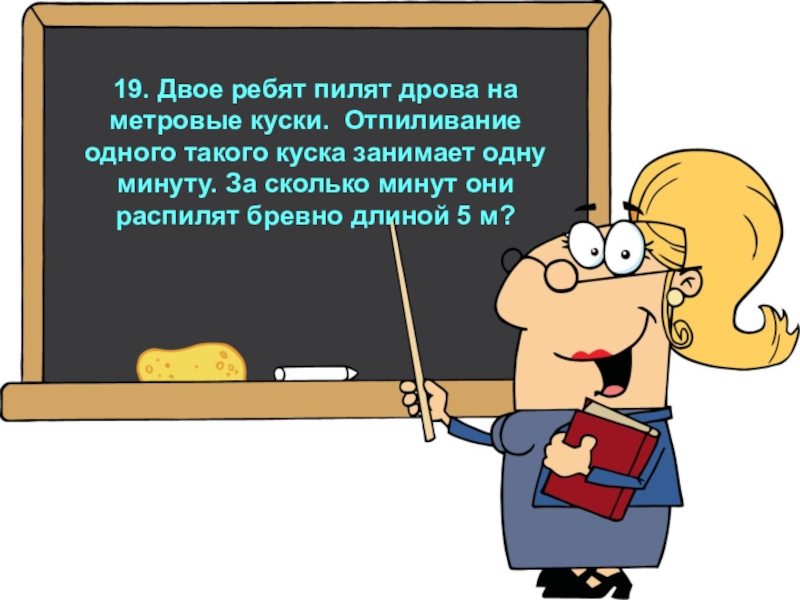 19. Двое ребят пилят дрова на метровые куски. Отпиливание одного такого куска занимает одну минуту. За сколько