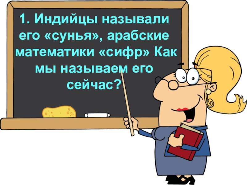1. Индийцы называли его «сунья», арабские математики «сифр» Как мы называем его сейчас?