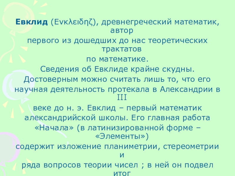Евклид (Eνκλειδηζ), древнегреческий математик, авторпервого из дошедших до нас теоретических трактатовпо математике. Сведения об Евклиде крайне скудны.Достоверным